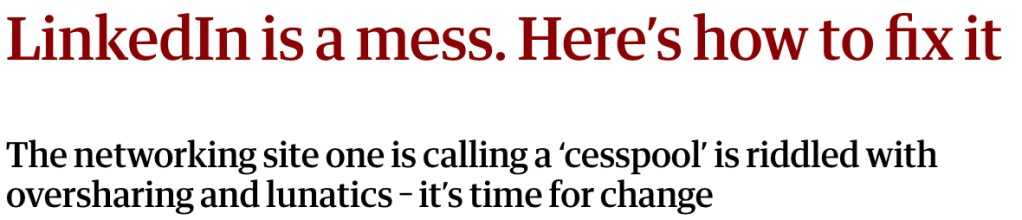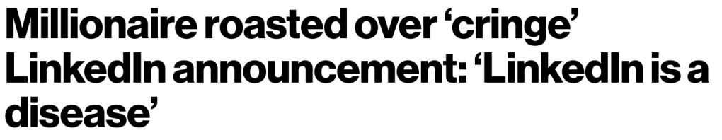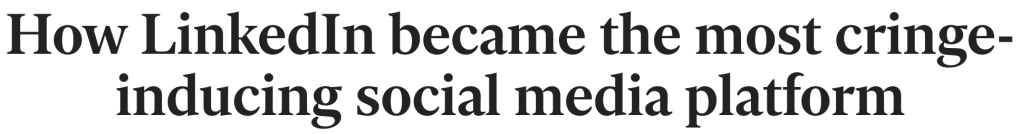 Later, LinkedIn with its focus on all things “career” and “technology”, and its pivot to a feed-first homepage design, felt inviting to those like me who were wondering what to write about. If you were an engineer, you wrote about engineering; if you were a manager, you wrote about management. There were many engineers and managers in the world, and, to nobody’s surprise, they had finally found something to write about that others were reading. Suddenly, they too were interesting to others, not despite their boring job, but because of it (!). The global cringe-storm that LinkedIn is parodied for today wasn’t a product of a new writing format to begin with (LinkedIn’s “Post” was a direct lift-off from Facebook), but of a collective that homogenised their writing in their shared quest to appear to each other more interesting than they really were. Techbros and white-collar workers all over the world converged to birth the cringe, the disease, the cesspool that LinkedIn is today.